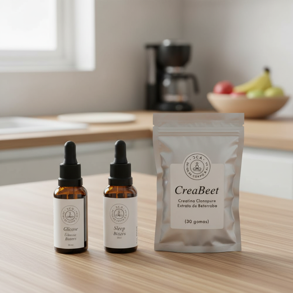 Combo com Sleep Bitters, Glicose Bitters e CreaBeet para dormir melhor, reduzir a vontade de doce e manter a massa muscular durante a viagem. Ganhe nécessaire exclusiva para levar suas gotinhas.