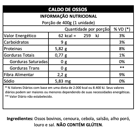 Nosso caldo de ossos bovinos é um verdadeiro elixir funcional para quem busca mais saúde de dentro pra fora. Rico em colágeno (são 10g por porção), ele é preparado lentamente com ingredientes frescos e nutritivos, como ossos bovinos, salsão, cenoura, cebola e alho-poró.