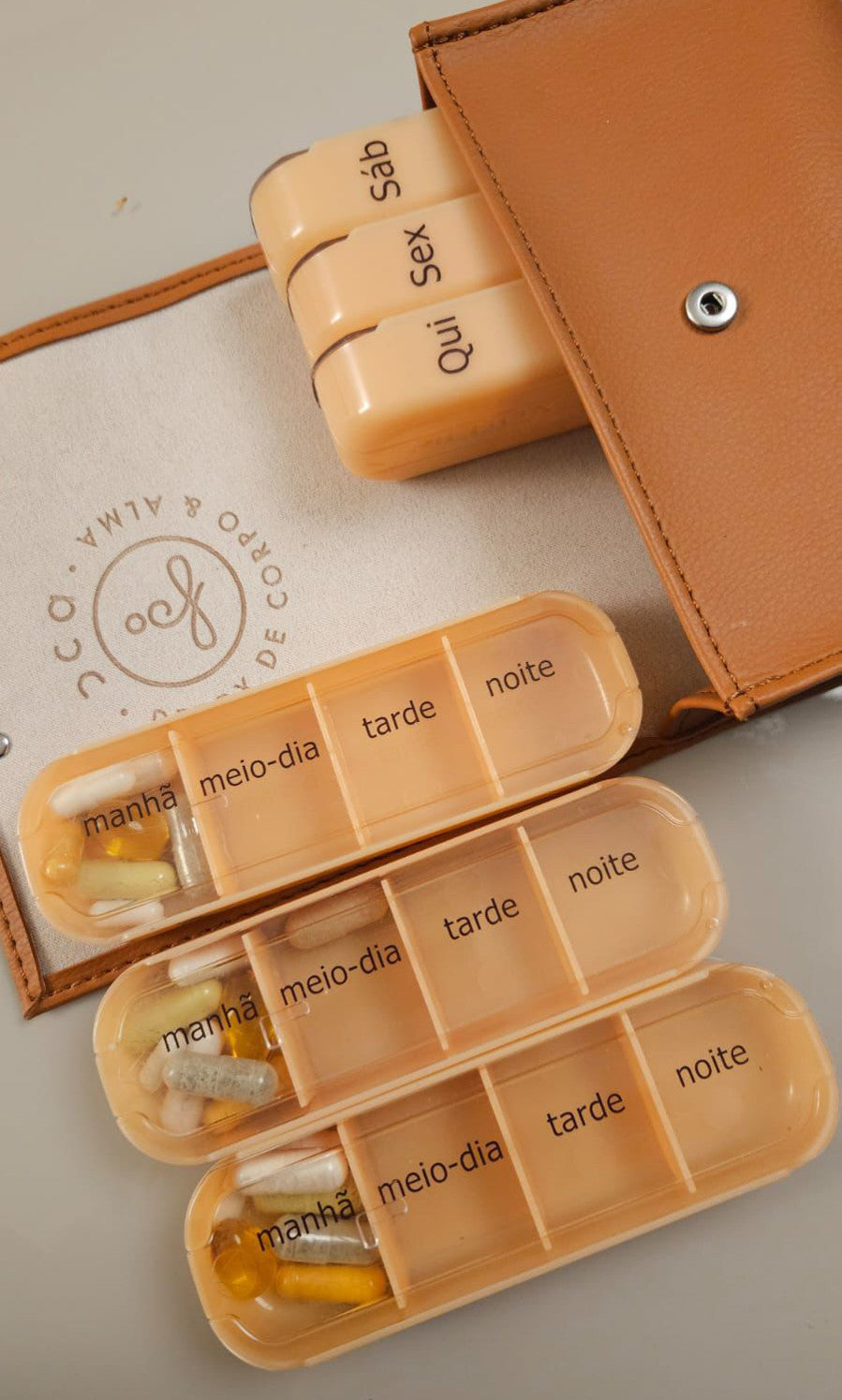 Porta suplementos em couro sintético. Módulos e compartimentos com bastante espaço e 4 divisórias em cada dia para organizar os suplementos da manhã, hora do almoço, tarde e noite. Separadores para segunda a domingo. Dimensões: Porta comprimidos: 15.3 x 13.2 x 4.7 cm. Módulos: 13 x 4 x 2 cm. Compartimentos/tomadas: 3 x 3.7 x 2 cm.